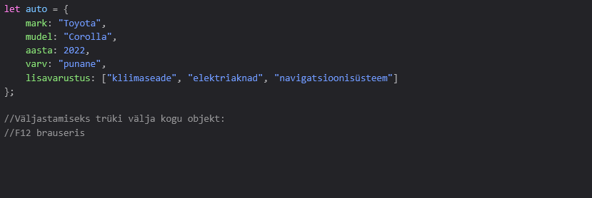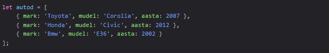 Objektide massiivi loomine on suhteliselt lihtne. Alustame näiteks autode andmete salvestamisega. Iga auto on esindatud objektina, mis sisaldab teavet auto margi, mudeli ja tootmisaasta kohta.