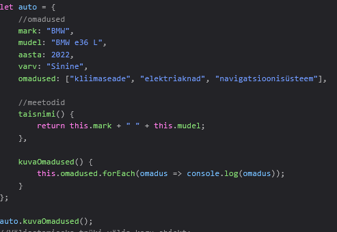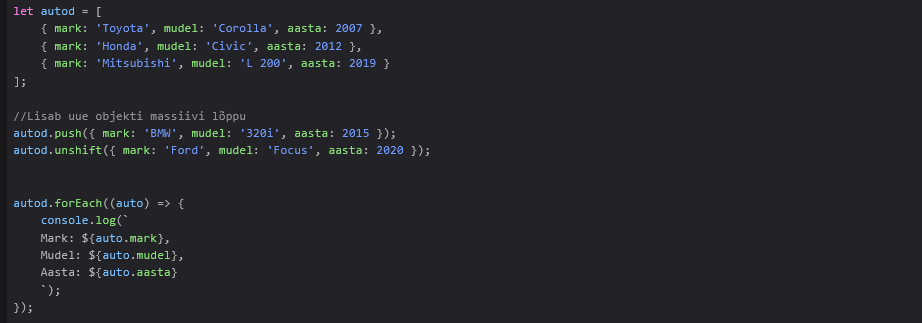 Lisasin Uue auto BMW e36 sellega koos lisasin veel kuvaomadused objekti millega on võimalik kuvada auto omaniku omadusi kui ka auto enda omadusi. Kui omadused on massiivis, siis kasuta for või forEach tsüklit.