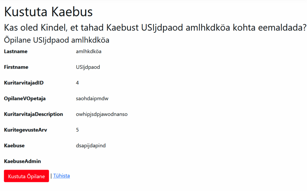 Ja viimaseks tuleb meil Delete vaade millega on võimalik oma sisestatud andmed ära kustutada:
